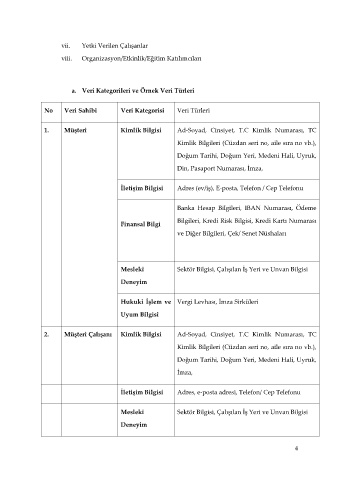 a. Veri Kategorileri ve Örnek Veri Türleri